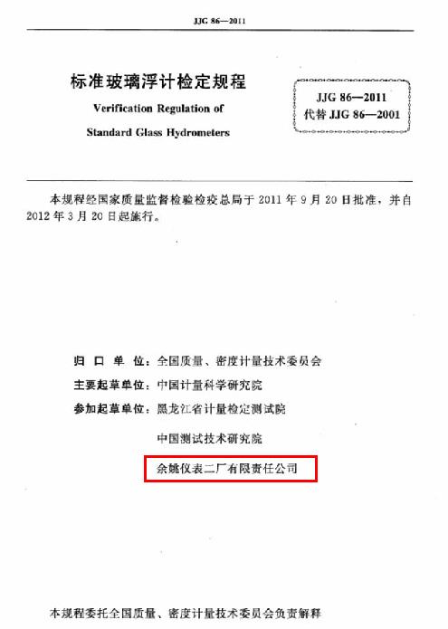 国家标准《标准玻璃浮计 JJG86-2011》参与起草单位,为参与起划的唯一企业单位